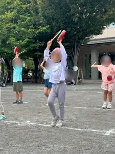 5歳児クラス【クローバー組】の遊戯は、子どもたちで話し合い、”去年や一昨年とは違った踊りを踊りたい”という思いから、「エイサー」を踊ることになりました。ゆったりとした動きの中で、パーランクーの音を全員で合わせる姿は、まさに年長としての育ちが見られます。