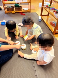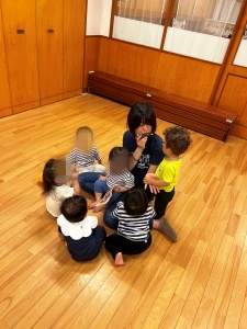 陽だまりの丘では、2歳児クラスより、毎週外部講師よる音楽遊びの時間があります。その音楽遊びを見に行ったことがきっかけとなり、“音色”に興味を示すようになったフリージア組(0歳児クラス)の子どもたち。ハーモニカ演奏が得意な保育士が「きらきら星」の曲を吹くと“何だろう~”と自然と周りに集まります。柔らかな音色に耳を傾けながら、何処かから聞こえてくる“見えない音”を探す姿が愛らしいです。