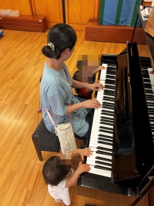また、ピアノで保育士が「とんぼ」や「うさぎ」を弾くと、ピアノへ向かい、“触っても良い?”と保育士を見つめます。背伸びをして鍵盤に触れ、偶然出る音を楽しんでいました。