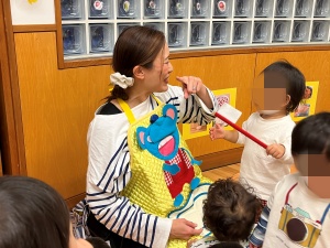 歯磨きを楽しくできるようにとエプロンシアターで「ちゅうたくんの歯磨き!」を見たり、看護師から絵本「はみがきあそび」を読んでもらったりしました。アプローチの仕方を工夫することで、子どもたちも楽しみながら、歯ブラシの動かし方を真似します。