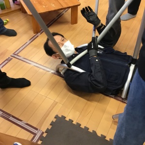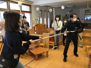 子どもたちの誘導や命を守りながらの不審者対応など、役割を担い動くことで、職員同士連携を取り、警察到着の想定時間まで、拘束することができました。また、訓練後は、さすまたの使い方などを教えていただいています。