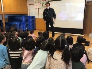 子どもたちは、警察の方から「いかのおすし」の話を聴いています。