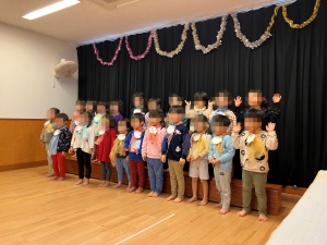 クリスマスをモチーフにして制作したオリジナルワッペンを身に着け“クリスマスの歌が聴こえてくるよ”を歌いました。可愛い歌声がみんなを笑顔にしてくれます。