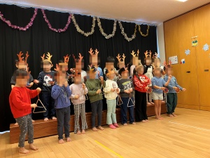 自分で模様や飾りを付けた角で可愛いトナカイに変身して、楽器を鳴らしながら“赤鼻のトナカイ”を歌っています。カスタネット、鈴、トライアングル、三つの楽器の担当は、子どもたちが相談して決めました。音を合わせる楽しさも味わい、笑顔で演奏しています。