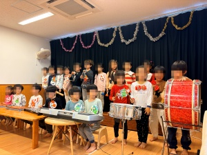 大太鼓、小太鼓などの打楽器に加えて、木琴、鉄琴、ハンドベル、キーボード…と音階のある楽器も使い“サンタが街にやってくる”を合奏しています。呼吸を合わせた演奏に皆が聴き入りました。演奏前後のお辞儀も揃い、さすがクローバーさんです。