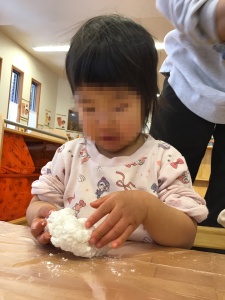 ついたお餅で、鏡餅を作りました。手粉をたっぷりつけて、ころころと丸めます。今年も元気で良い年になりますように…。