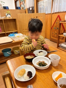お餅をつく前の蒸したてのもち米を味わうと「あったかーい、美味しーい」と顔をほころばせています。もち米とうるち米の違いを知るきっかけにもなったようです。実際にお餅を食べるのはもう少し大きくなってから、と給食では、乳児はおはぎ、幼児は五平餅を味わいました。「きなこが好き」「私はあんこが好き」「僕はぜーんぶ好き…」と堪能していました。