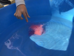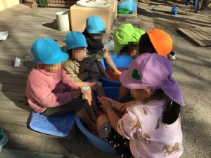 出来上がったバスボムは、持ち帰ってお風呂で楽しんだり園庭で足湯をしたりしています。タライのお湯にバスボムを入れると…、泡が出る様子を見て「シュワシュワしてる~」と大喜びです。ほんのりと香りも漂います。