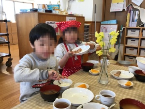 店員さんお勧めの冬の花“フリージア”を買って保育園へ戻り、以前教えていただいた“水あげ”をしたり、花の色や形などアレンジメントを楽しんだりしながら卓上花に仕上げます。鮮やかな色と、ふんわり漂う香りを楽しみながら食事をする子どもたちに笑みが溢れます。
